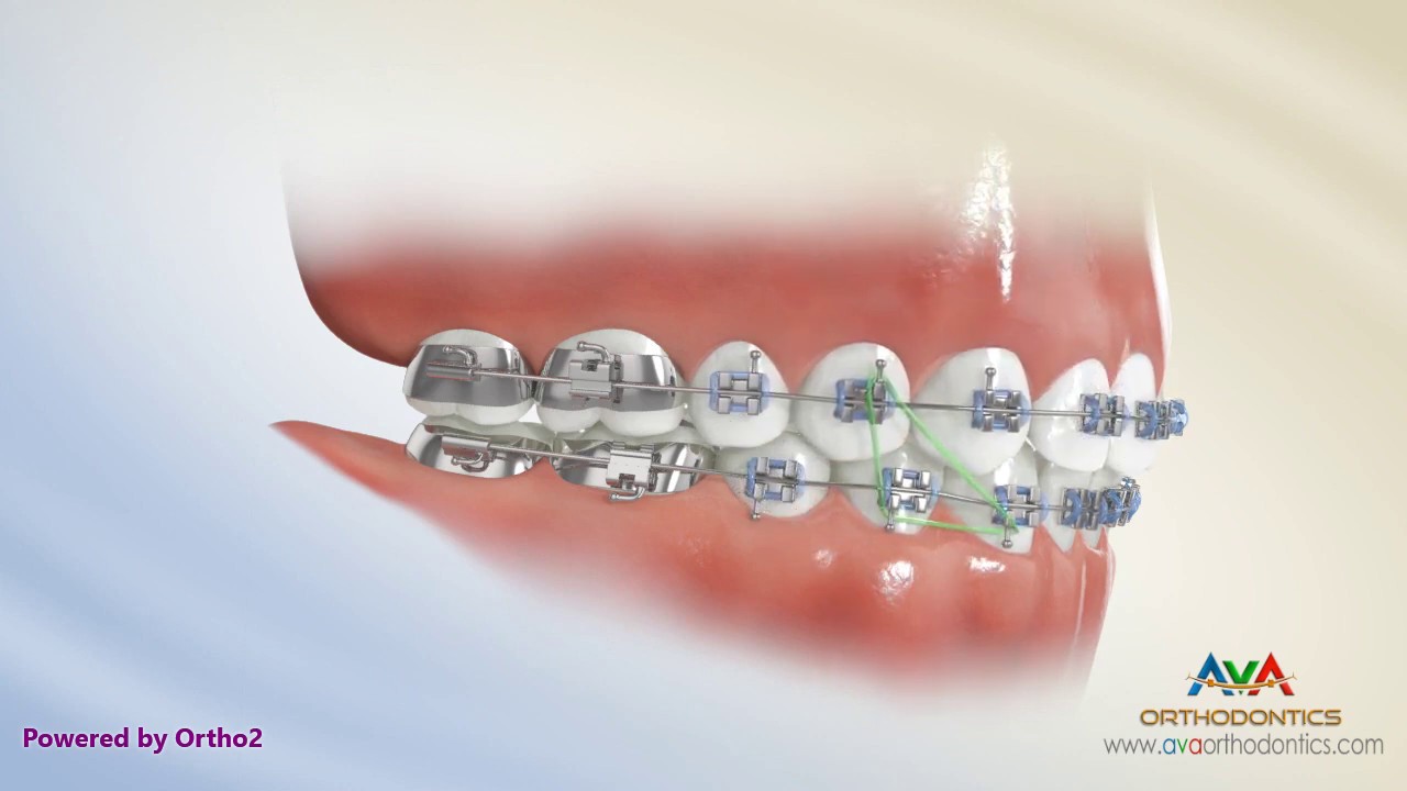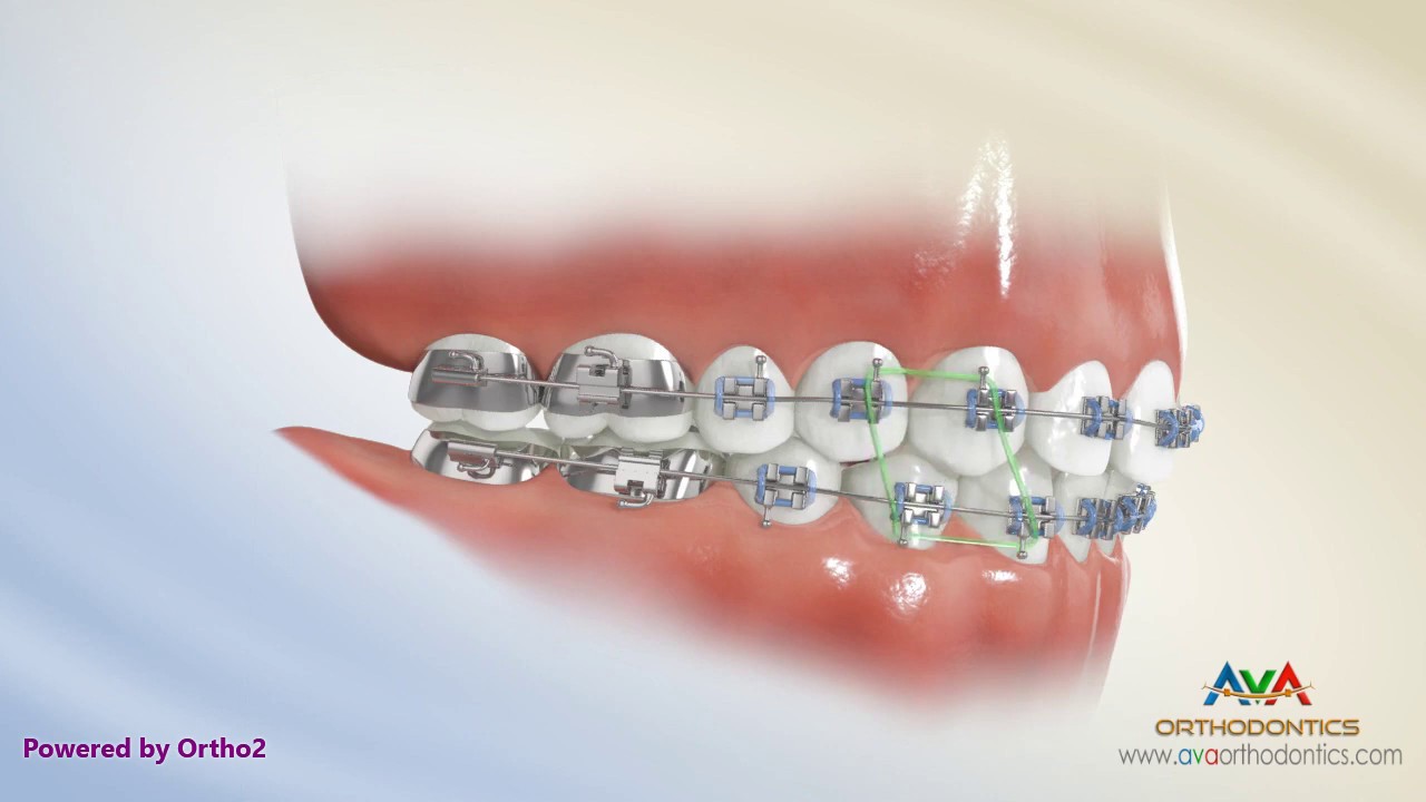 This pattern helps to correct the overbite (overjet) and grow teeth together at the same time. Wear the rubber band from the hook on the upper canine to the hooks on the lower first and second premolar.